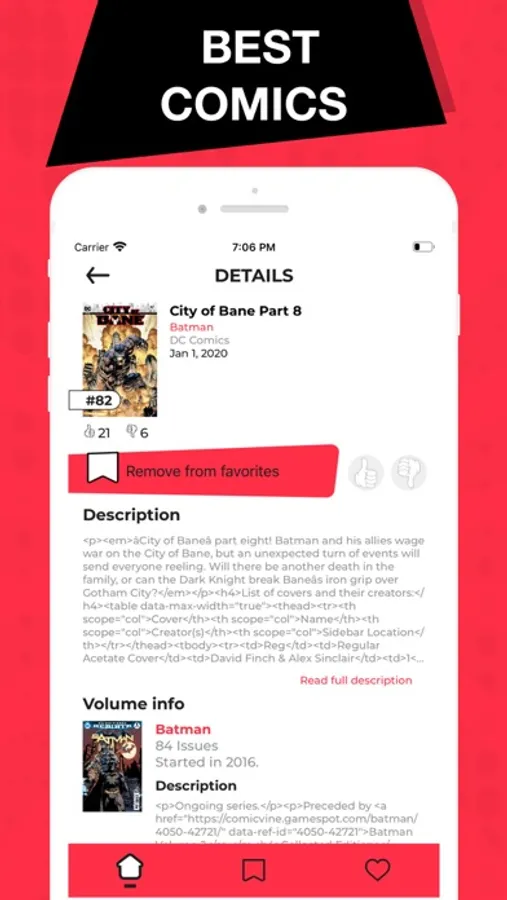 • Details of all comics: Access detailed information on each of the comics such as: description, rating, release date, editorials, etc.
