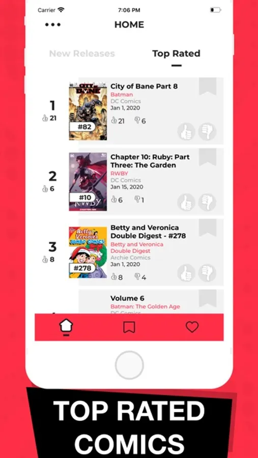 The latest comics: discover new releases! It is an application designed to discover the best comics of DC Comics, Marvel, Kodansha, Viz, among others and keep up to date with the most recent releases of your favorite comics like Batman, Wonder Woman, Superman, among many more. Save your favorite comics, rate them and help more people know them. Discover which are the best rated comics.