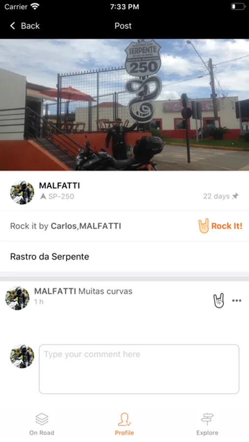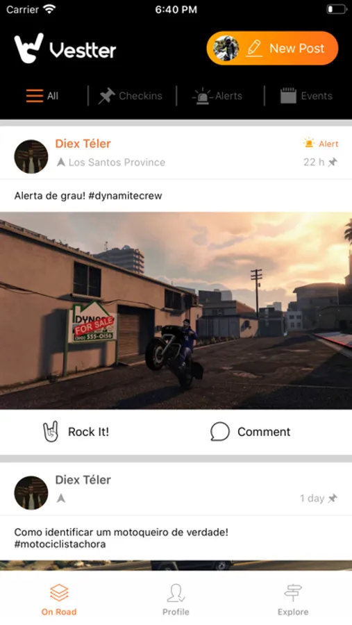 - On Road: its a time line where the posts are classified by a type (general, check-in or Alert). General are desired to generic posts, check-in to identify the Rider position and Alert is a kind of post to warning dangerous situations to another motorcycles in the same area. On Road provides too a filter to find motorcycle events sorted by data. Only Alert and event posts are viewed by any user independent of a friendship connection.