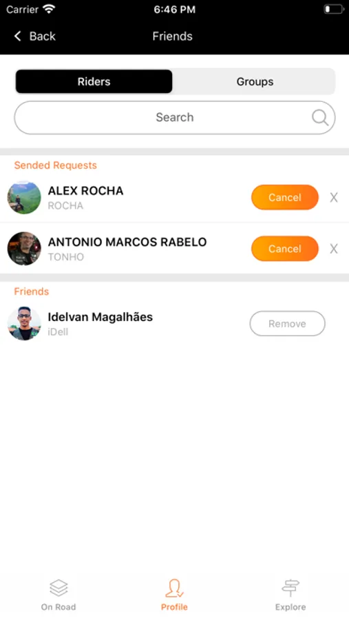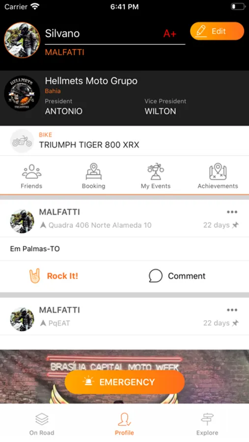 - Profile: is a user area that a motorcyclist could edit your profile, manage your individual posts, friends, reservations, conquers and interested events. In this area users can access (if you are a member of a motorcycle group) the group area. Users can join in a motorcycle group by create your own group or by receiving a invite by a motorcycle group already created by another user.