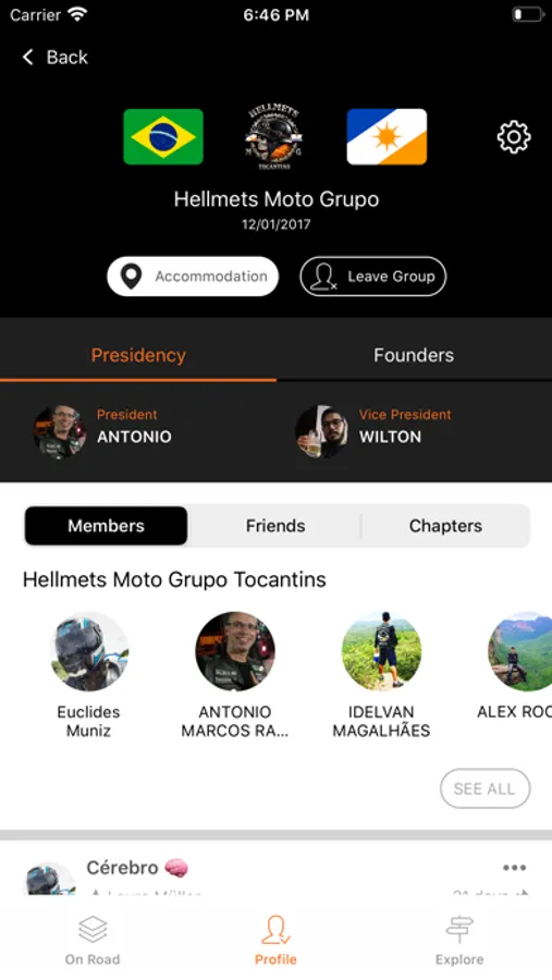 Inside a motorcycle group area its possible to see who are the president and vice-president, group founders, members, friends and chapters of this group by the world. Only admin users will have access to administrative area to perform the management of the group.