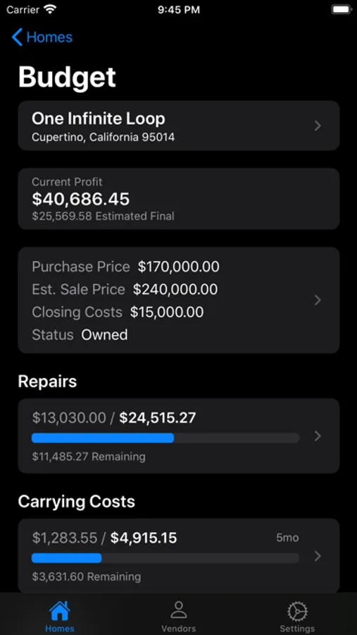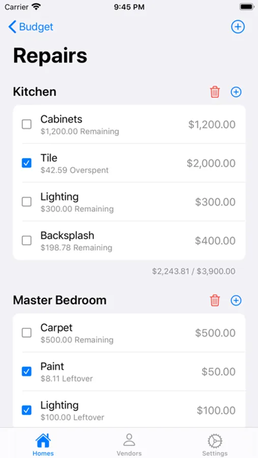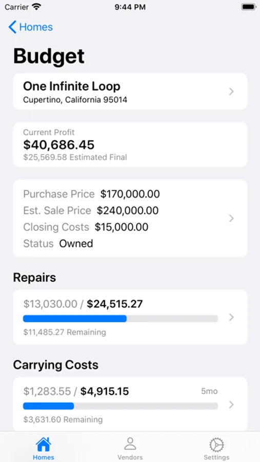 Keep track of all of your renovation’s expenses in one place. You can specify who was paid, when it happened, and what budgeted item it was created for. An expense can be made for repairs and carrying costs or just by themselves. As you create expenses for budgeted items, you will easily be able to see if you are within your budget.