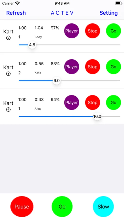 6. Commands to start, pause, slow down, or have emergency stop of each individual kart, or all the karts at once.