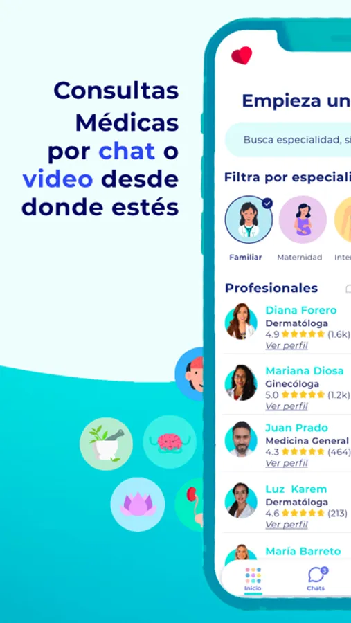 Pediatras siempre disponibles para tus hijos; ginecólogas online para ayudarte a planificar o sacarte de dudas; nutricionistas para brindarte la mejor dieta, dermatólogos, para todas esas dudas de lunares manchas o irritaciones y otras 20 especialidades para lo que necesites.