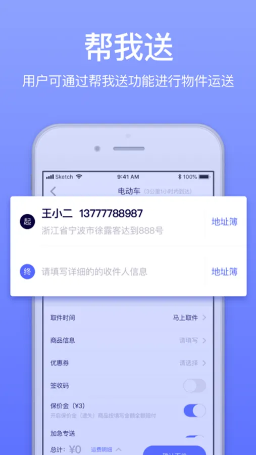 当你有急件需求时,而自己没有时间派送,你只要在GG来送平台输入你的取件地址、送达地址,下单后,GG来送平台为你计算出你附近的跑腿员,将你的需求信息推送给跑腿员,接单跑腿员会迅速上门取货,1小内送达全城。