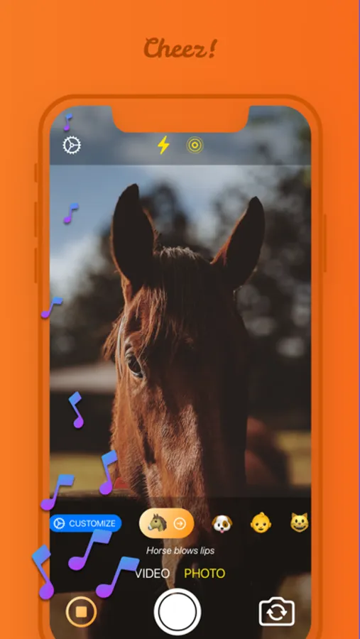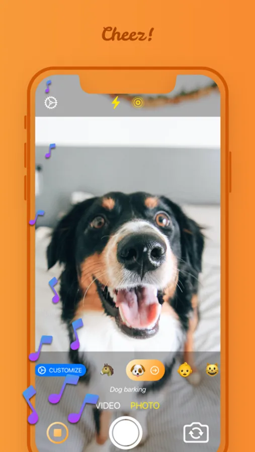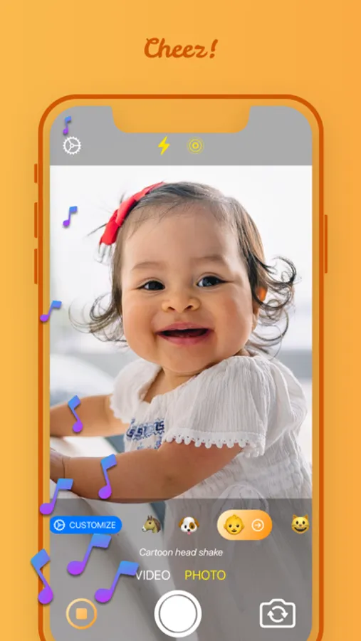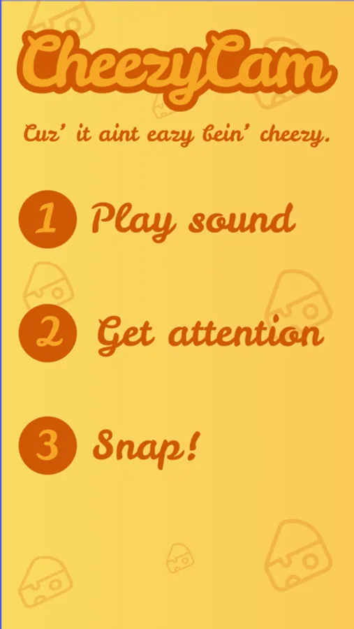 CheezyCam plays a sound (choose between a variety of effects, animals and silly sounds) to get the attention of your subject.