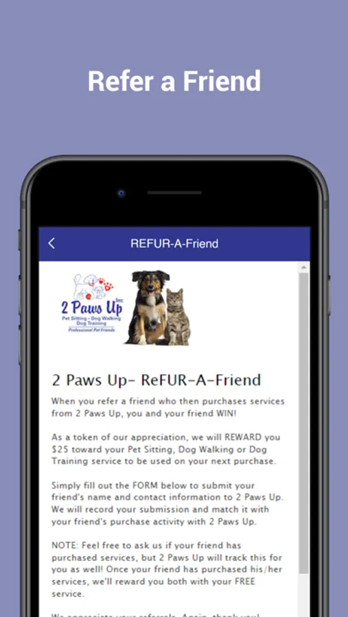 Download our app and have instant access to all the information you need to manage your pet care needs with 2 Paws Up from the convenience of your mobile device.