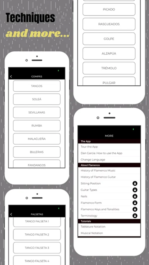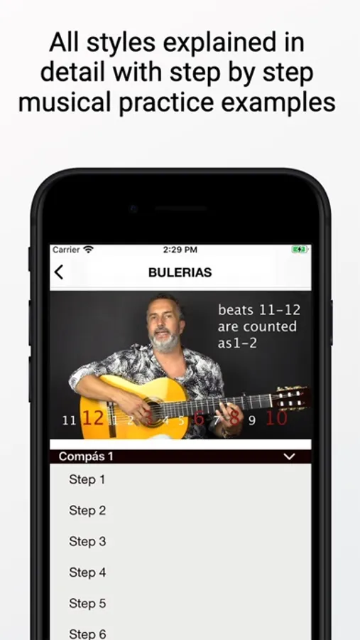 Every technique, style and falseta is presented with an instructional video followed by dozens of exercises designed for the user to craft, build and master the specific skill.