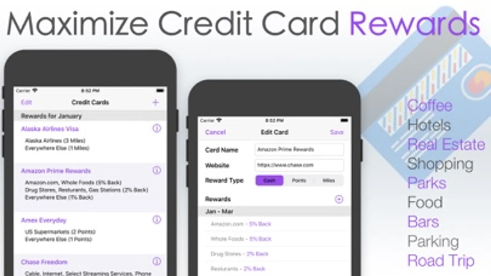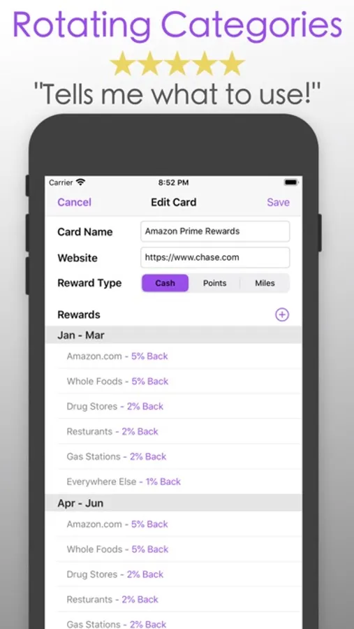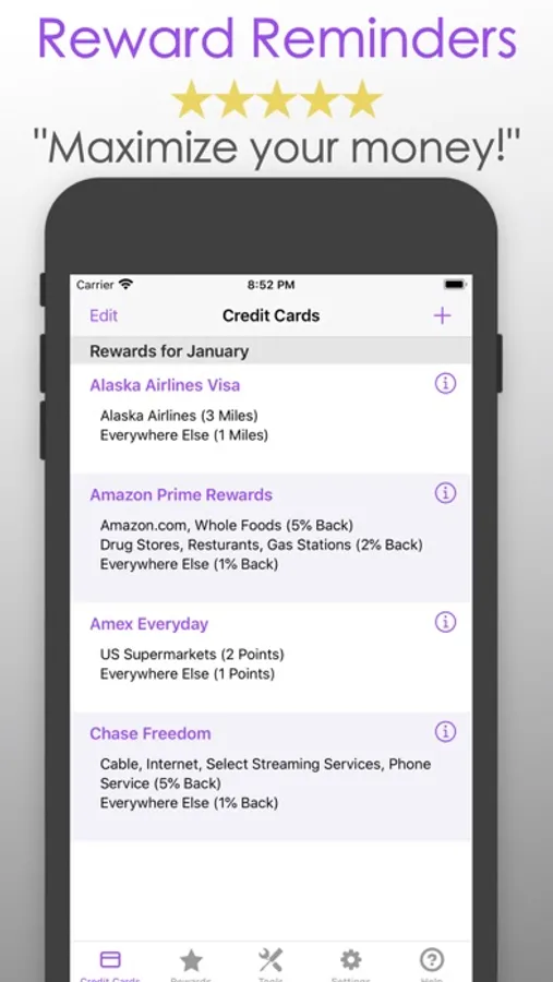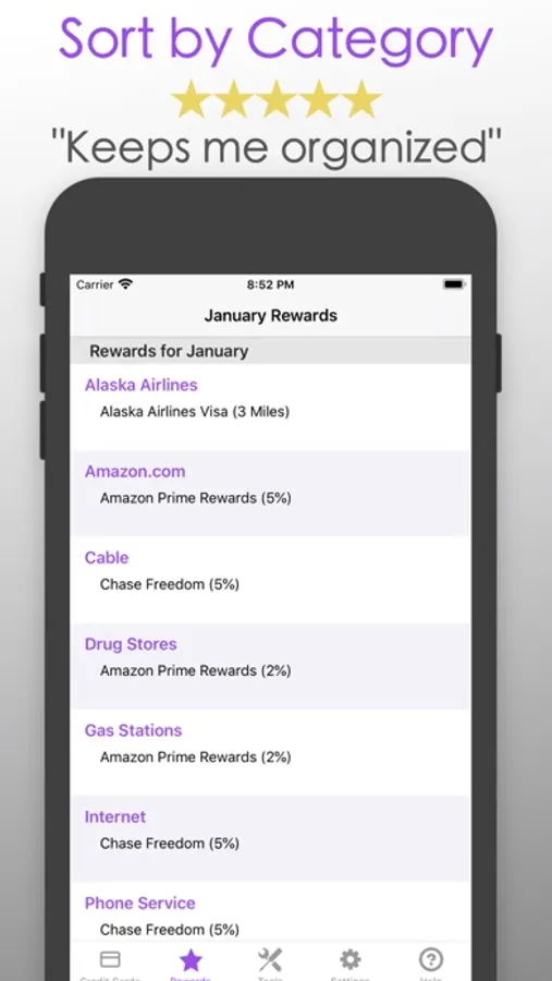Many credit cards offer higher reward rates on rotating categories such as groceries, gasoline, movies, etc. Having multiple cards with varying rewards programs can pay big if you can remember the categories each month. This application eliminates the hassle of remembering all those categories and helps you realize your full reward potential!