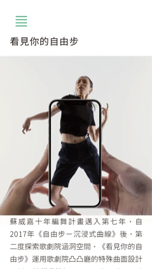For the seventh year in SU Wei-chia’s decade-long choreography project. FreeSteps AR Yours, audiences use their tablets or smartphones as they walk freely within various spaces in the venue, while using augmented reality technology to see different dimensions of the dance.