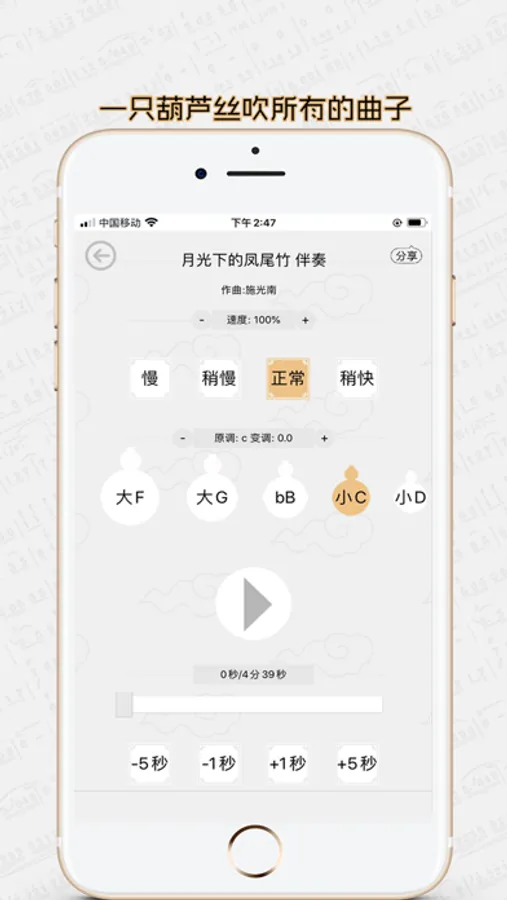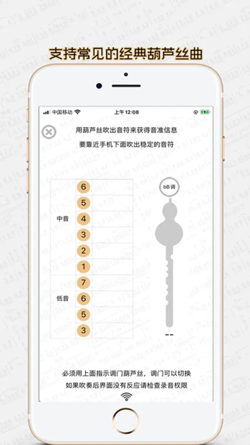 **注意** 该功能需要开启麦克风权限,因为要对葫芦丝进行录音分析频率。