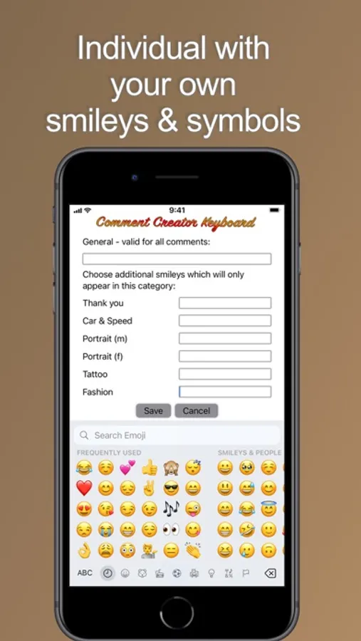 Extend the comments individually with smileys and symbols. You can choose the smileys and symbols which you like and identify with. Enter as many as you want in the settings, the app will randomly add some to the comments.