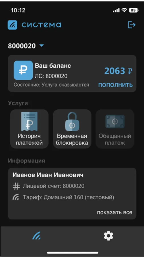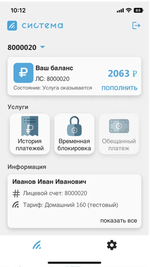Приложение для абонентов компании 'СИСТЕМА'. Абонентам после авторизации будут доступны функции личного кабинета, через который можно проверить состояние лицевого счета, активация обещанного платежа и приостановка обслуживания.