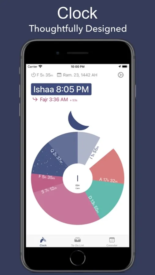 Salaty is a carefully designed prayer times application that integrates an intuitive clock. The thoughtfully designed clock gives you more insight into time, enabling you to easily glimpse the remaining time till upcoming prayers and the elapsed time of the current prayer.