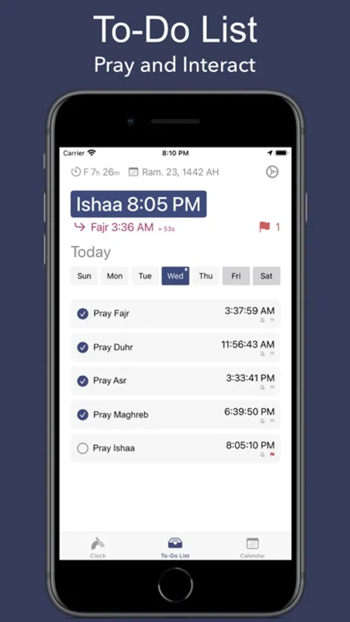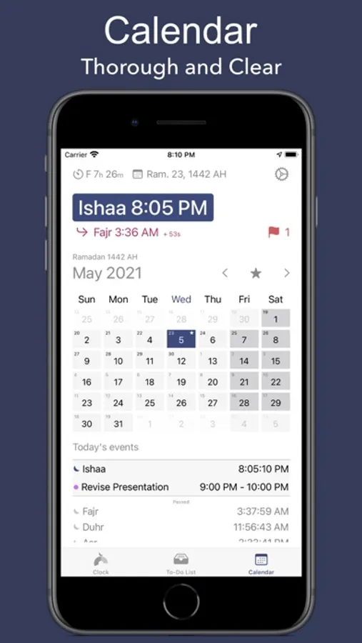 - Includes a calendar view that enables you to see the prayer times as well as your events.*