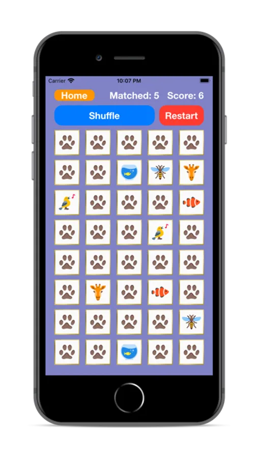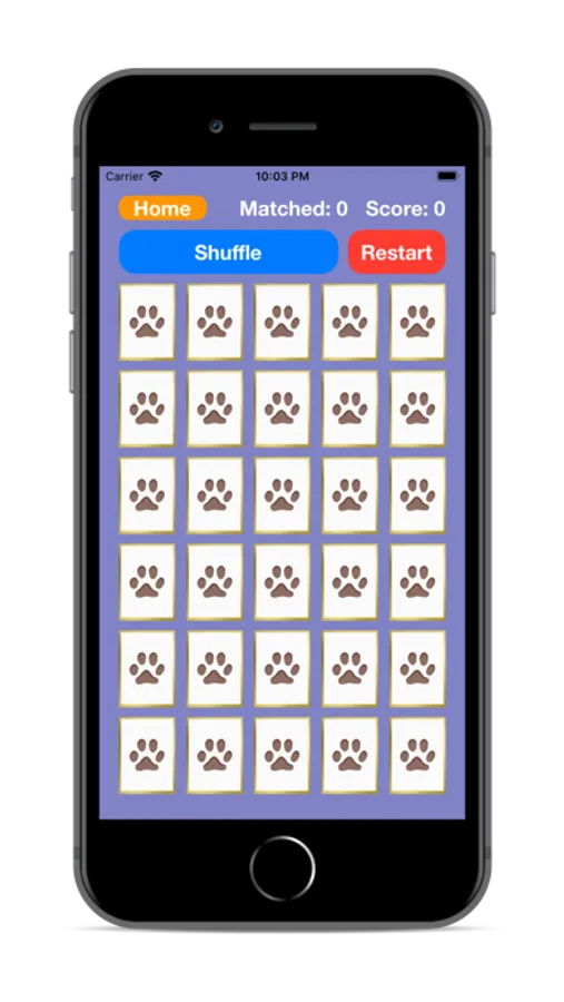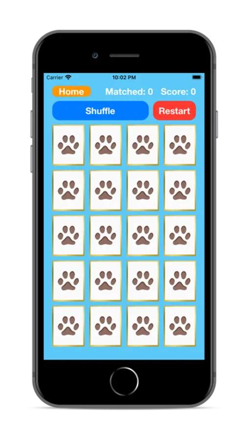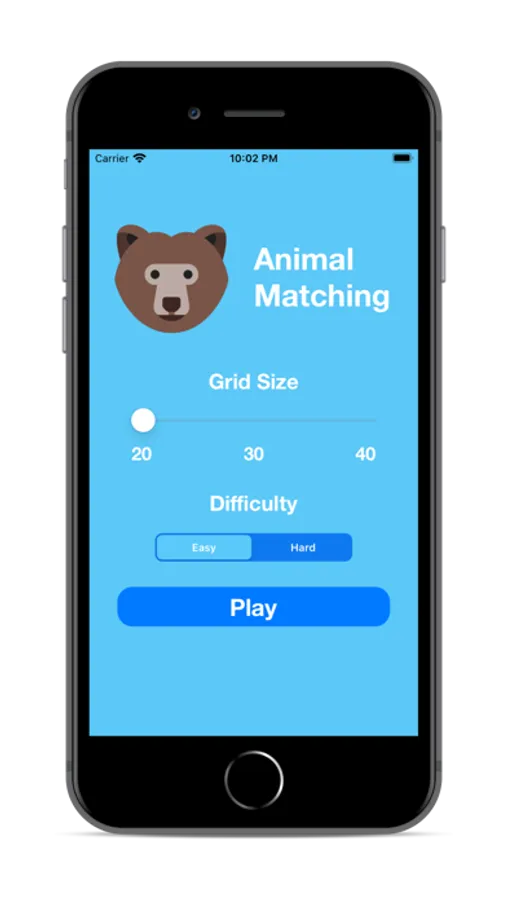 The player starts off by selecting a grid size - they can choose between 20, 30, or 40 cards. The cards are shuffled and initialized to be displayed face down. The player needs to tap cards to flip them over and match them with their corresponding pair.