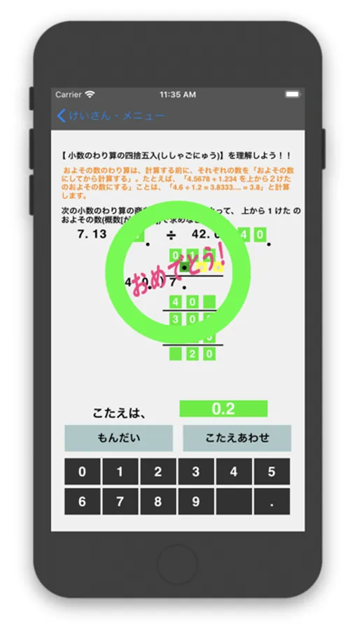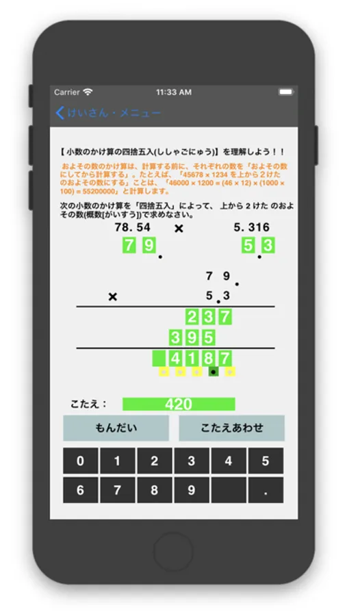 概数(がいすう)の算数計算トレーニングのアプリです。概数と言うと難しく聞こえますが、要は「およその数」で、「切り捨て、切り上げ、四捨五入」の3パターンを学習します。単に四捨五入できるだけでなく、「和・差・積・商」の四則演算による四捨五入が出来るようになるのが本アプリの目標です。概数は小学生で初めて習いますが、中高生になると、「有効数字」として再び登場します。苦手な人も多いと思います。大学受験などで必要になり、有効数字の理解は大変重要になります。ぜひ、このアプリで「がいすう計算」をマスターしましょう。