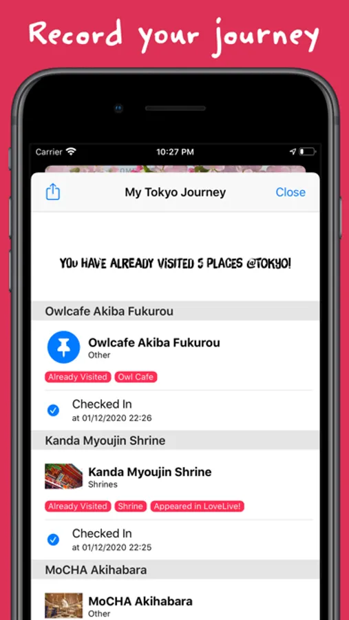 - Record your journey by location check-in. Share your journey screenshot with friends