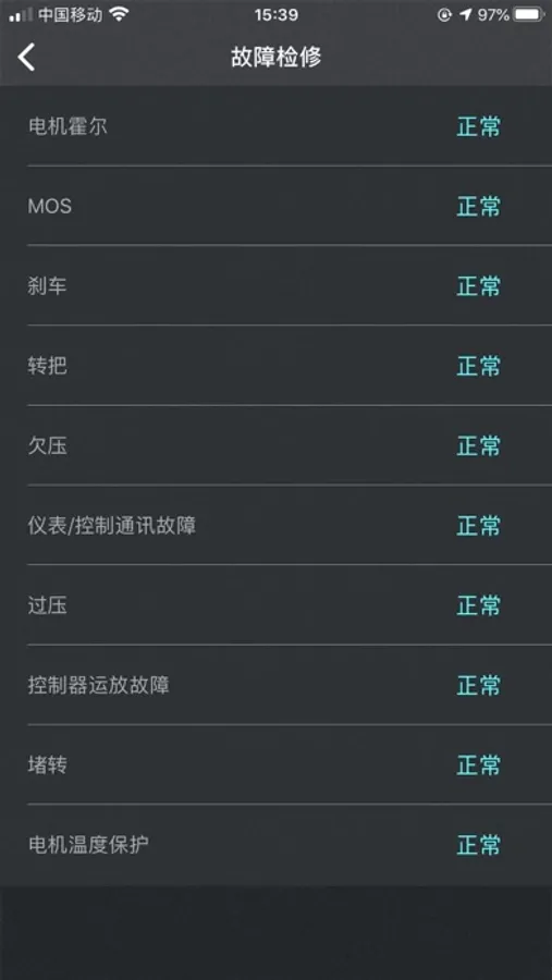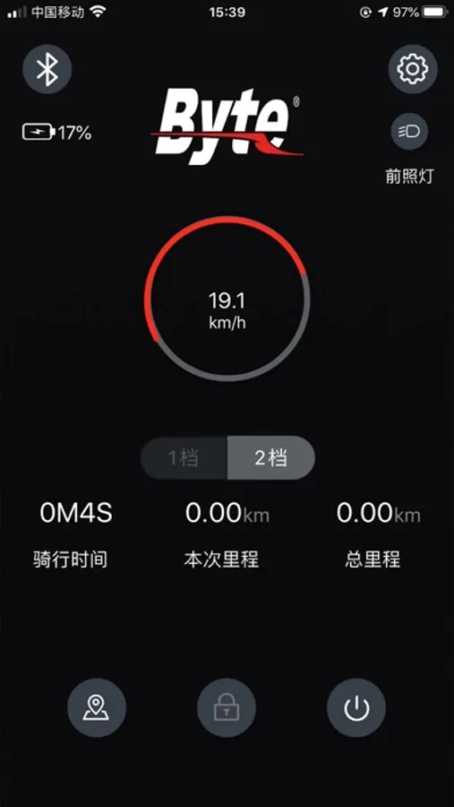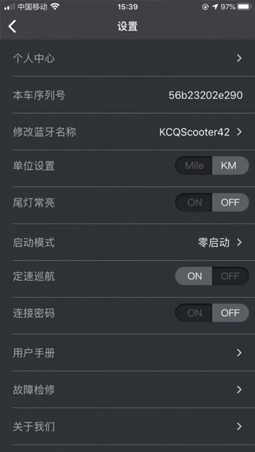 通过手机蓝牙链接电动滑板车,连接成功后没可以在手机APP上获取刀车辆的速度、电量、灯光状态、档位、总里程以及本次行驶里程、骑行时间、启动模式、等信息。并可以在手机APP上对档位、灯光、巡航模式、启动模式等进行控制,还可以修改车辆的蓝牙名称、开启或关闭车密码,在设置中,可以查看车辆的故障状态,方便维修。