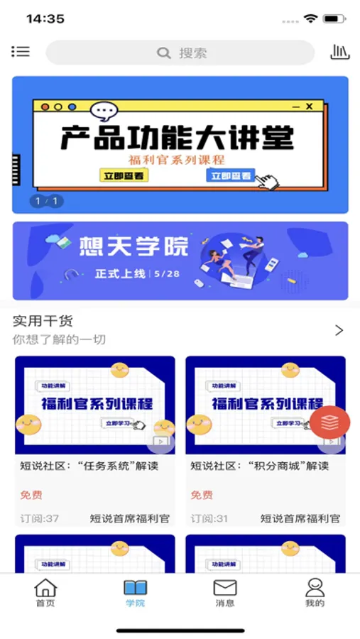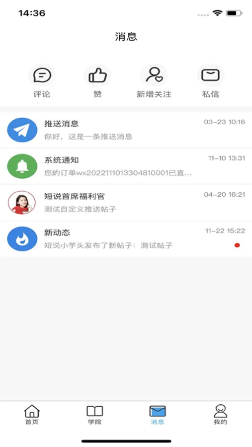 消息:用户接收互动消息、系统通知、营销消息。