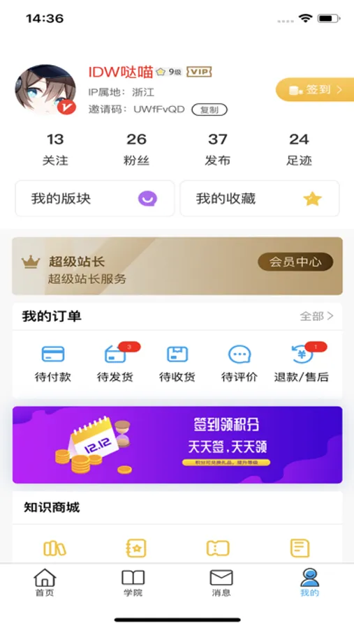 我的:用户可以在我的页面查看个人信息,在任务中心查看自己等级以及积分详情,并通过做任务获得相应积分。