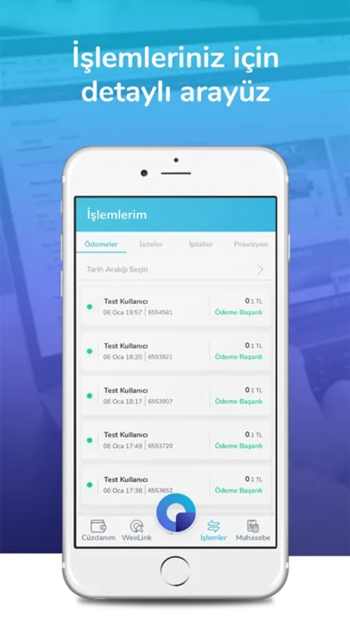 “İşlemler” sekmesinde başarılı başarısız tüm ödemelerinizi görebilir, iptal veya iade edebilirsiniz.Provizyon işlemlerinizi iptal edebilir veya ödemeye çevirebilirsiniz.