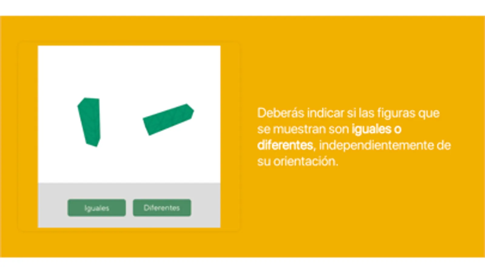 - Figuras rotadas: esta tarea combina las habilidades viso-espaciales (capacidad de analizar, representar y manipular mentalmente material visual) con la velocidad de procesamiento (capacidad de realizar tareas mentales con rapidez).