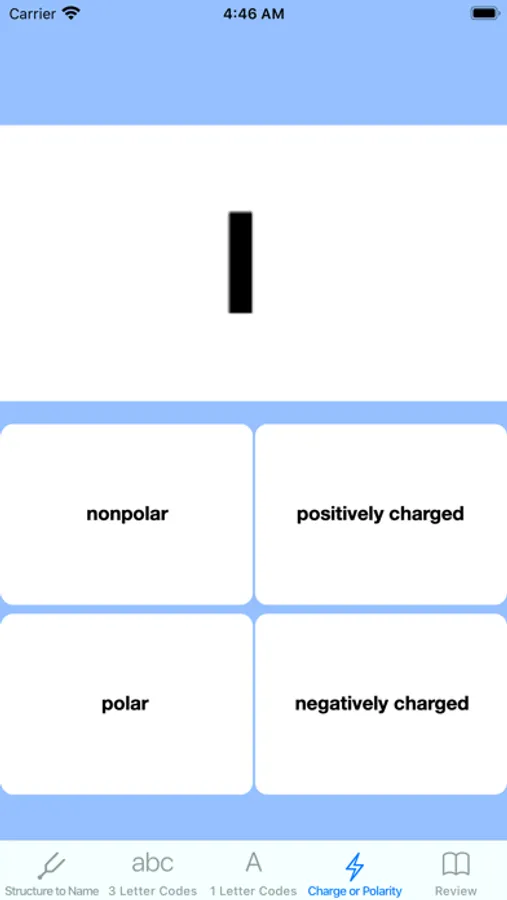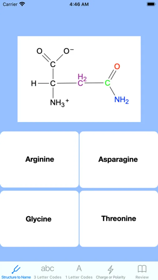 Amino Acids Structures Tutor is an app to teach you the complete structure of each of the twenty amino acids. For ease of learning, the common structure between each of the twenty amino acids is presented to the left side of the picture in black and each unique side chain is presented to the right with most atoms displayed in different colors to help memorize each element in the side chain and their numbers. You will learn each structure that corresponds to each amino acid name. You will learn which structure and which amino acid full name corresponds to which three letter code for the amino acid. You will learn which structure and which amino acid full name corresponds to which one letter code for the amino acid. You will learn to associate the charge or polarity with each structure, full name, three letter code and one letter code. There is a review section which shows the structure, full name, three letter code and one letter code together as a refresher and memory aid.
