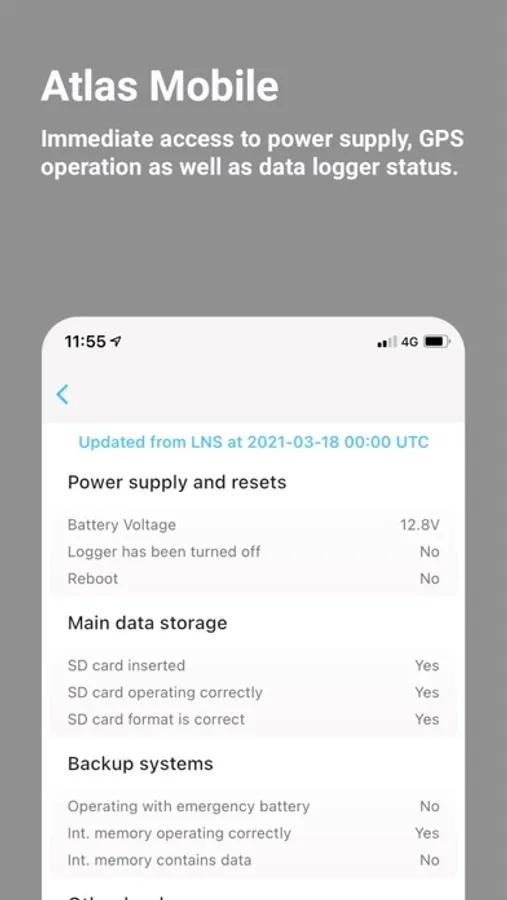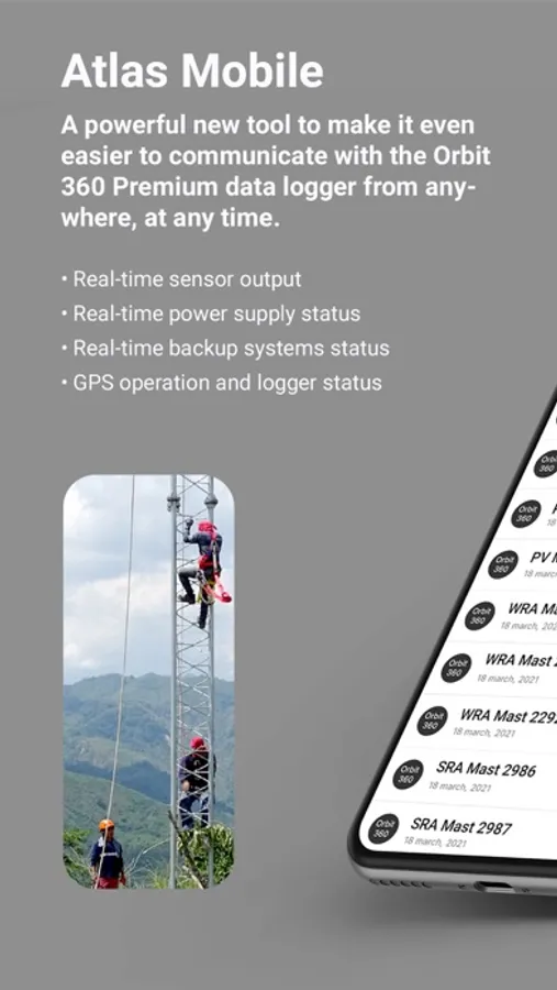 If you are operating Orbit 360 data loggers, Atlas Mobile lets you connect to them directly from your phone. A very convenient way to quickly check the onsite power supply status or the status of the data logger itself. You can even connect in real-time with the data logger for real-time sensor readings.