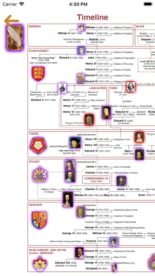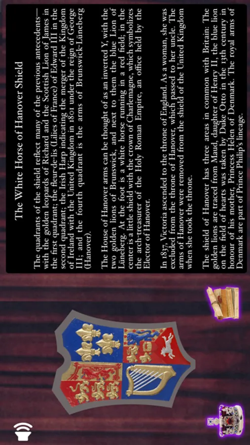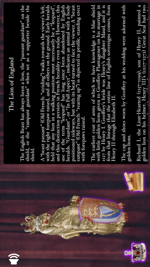 An interactive app that illustrates and teaches the lineage/genealogy of the royal line of Queen Elizabeth II utilizing heraldic icons (beasts). Includes a printable timeline of the royal family tree from 1066 through to 2022. Incorporates music, art, text, and narration to enhance the user’s experience. An enjoyable way to learn the history of the Monarchs of Britain and the United Kingdom. This multi-sensory app has been created to appeal to general audiences as well as to meet the needs of students.
