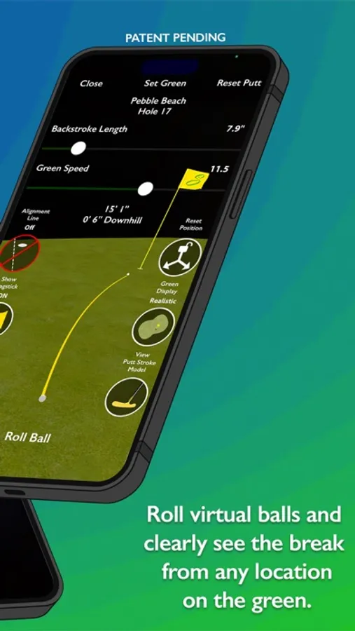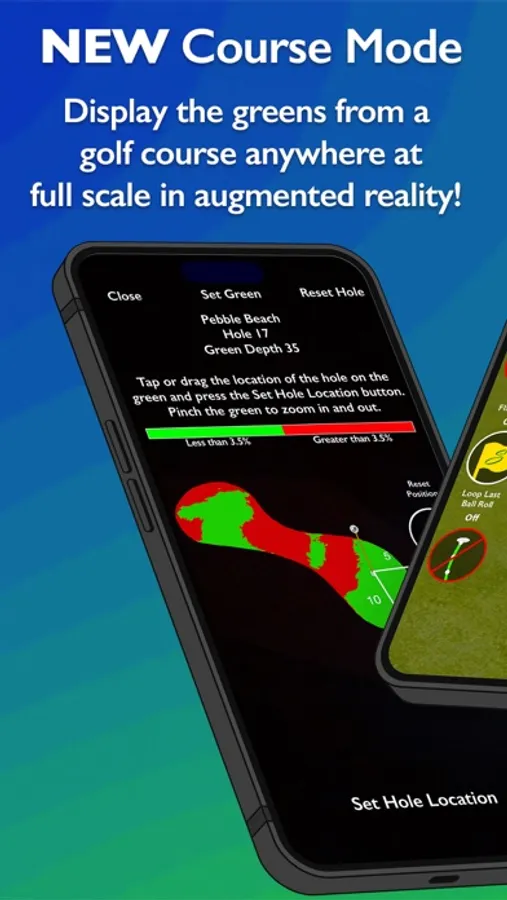 • *NEW Course Mode - Sharpen your visualization skills with our new revolutionary, patent pending, virtual ball rolling simulator that displays 3D greens from any course in our database in life-sized form in augmented reality, allowing you to see how balls will break as if you are standing right there on the green! You can set the hole location anywhere on the green, see how many paces the pin is from the edges of the green, roll virtual balls on different green speeds, and experience how they interact with the hole and/or flagstick.