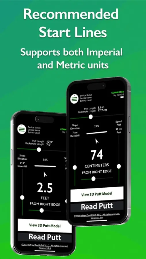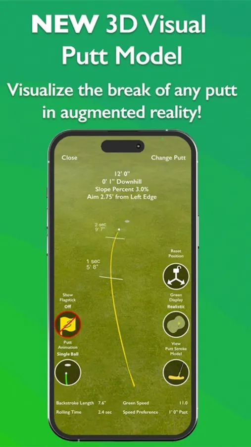 • *NEW 3D Putt Model - Displays a 3D animated rolling model of any putt inside 30 feet in augmented reality, giving you a 1st person point-of-view (POV) angle showing you the rolling arc of your putt and distance timelines that help you visualize the rolling speed of putts.