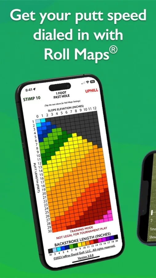 • *Roll Maps - Our popular color-coded charts that trains your distance control and feel on the greens quickly. Contains both a Training Mode and Tournament Mode that conforms to the Rules of Golf.