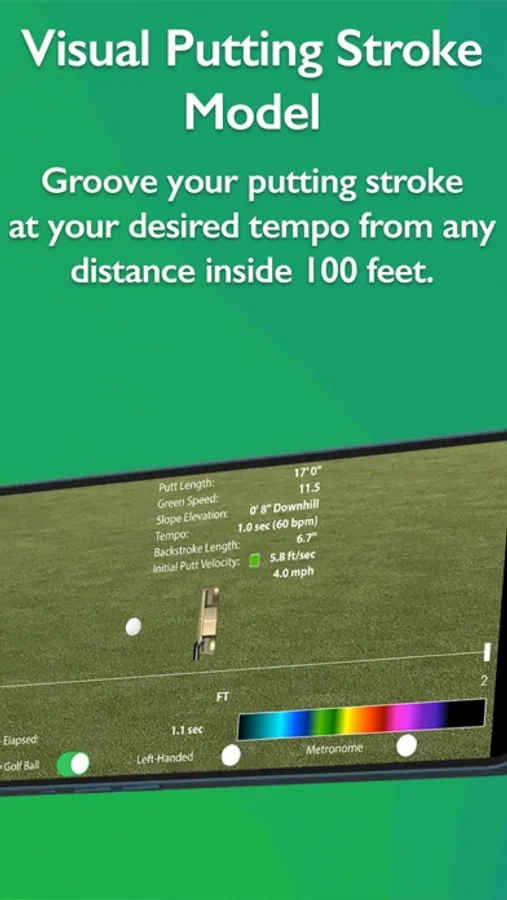 • *Life-Sized Putting Stroke Model (iPads only) - Our putting stroke model with the golf ball and putter enlarged to their life size, so you can follow the putter being animated on the screen, giving you an accelerated path to hitting putts at optimal speed!