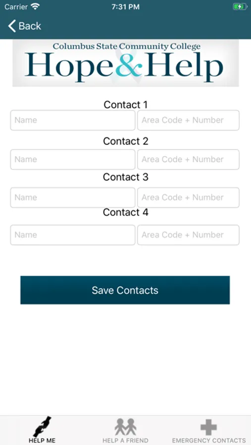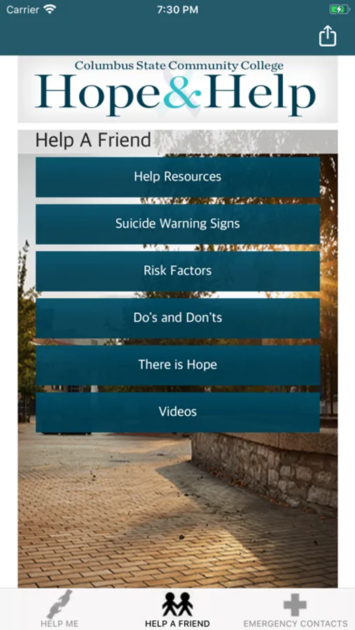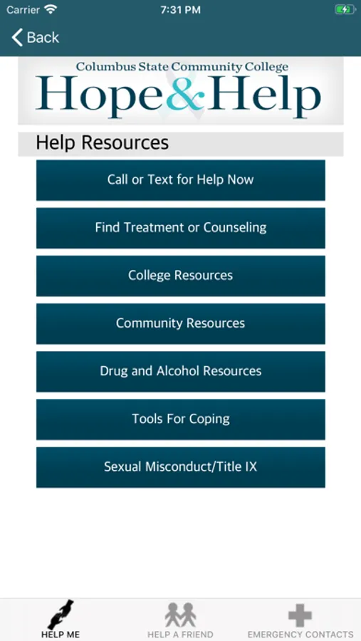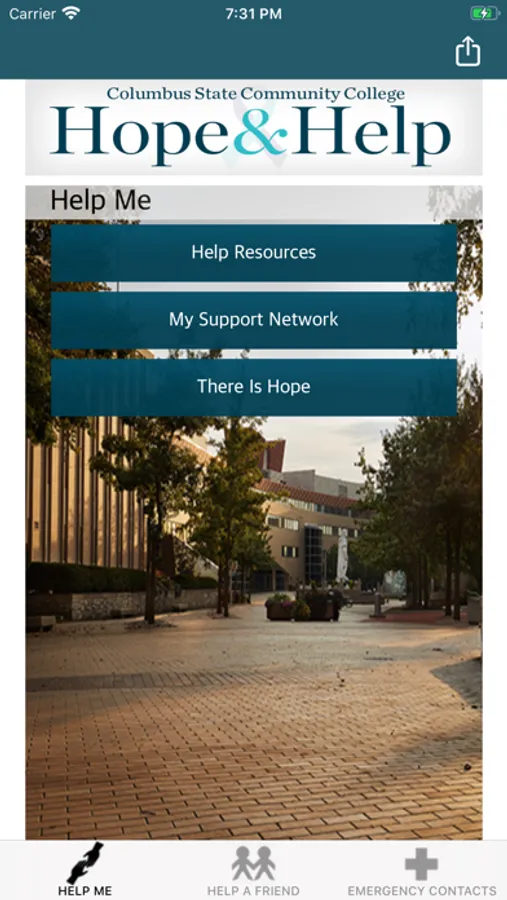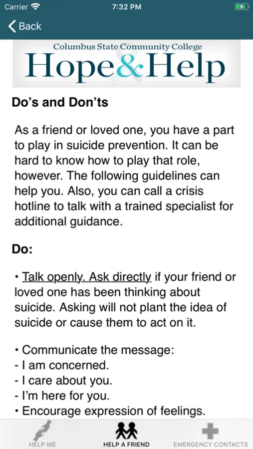 Columbus State Community College's Hope & Help app provides guidance for supporting a friend in need, suicide prevention, or coping with mental health challenges. With the “My Support Network” function, users can create a customized collection of just those contacts they especially want to quickly access and reach out to by phone or text during difficult times. Hope & Help also provides easy and centralized access to potentially life-saving resources and services offered on campus and in the community, including crisis hotlines. The Hope & Help app is designed for students, parents, friends of students, faculty and staff of Columbus State Community College, located in Columbus, Ohio. The Hope & Help app better prepares people to help a friend, loved one or themselves.