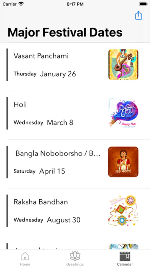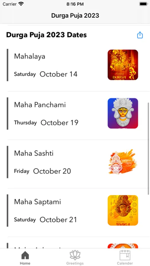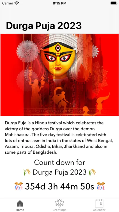 Durga Puja is one major hindu festival celebrated with lots of enthusiasm in several parts of India. In our app, you will get a countdown to DP 2023, DP Greetings to share with your family and friends on any Social Media. Along with Durga Puja, greetings and dates of other major Indian festivals are also available.