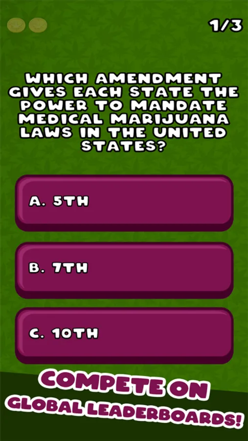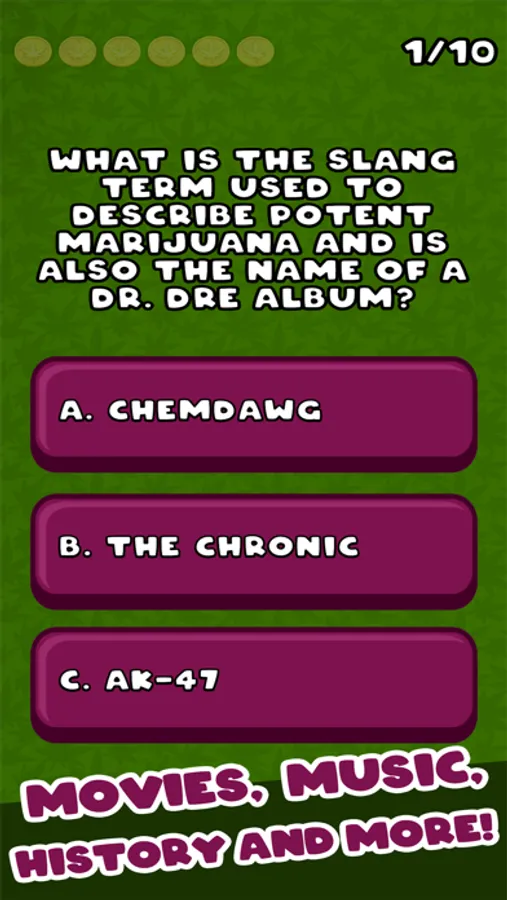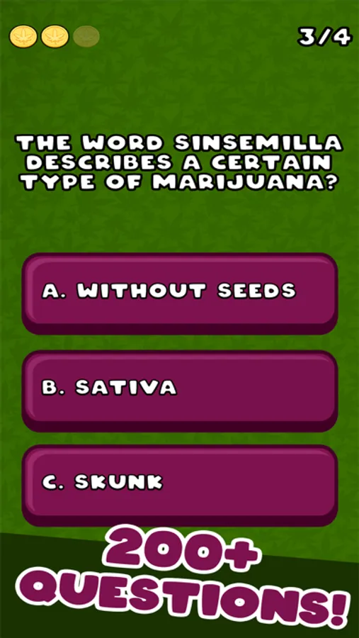 It's time to work your way up in the marijuana business and become the Ultimate Stoner Guru. In order to succeed, you must correctly answer all types of marijuana related questions about Movies, Music, History, Slang, Politics, Law and more. As you answer questions correctly, you will earn rewards and get new titles. The challenge is to become Ultimate Stoner Guru. Beat other players by getting the high score and bragging rights on the leader board!