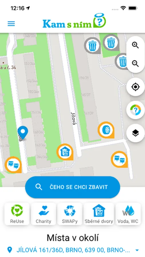 Aplikace Kam s ním? nabízí snadné a rychlé vyhledání míst a nádob ve vašem okolí, kde se může legálně "zbavit" svého odpadu. Obsahuje místa pro plasty, papír, sklo, textil, olej, tuk, kov, elektro, auto, moto, pneu, baterie, světla, zářivky, výbojky, LED, stavební odpad, nebezpečný odpad, léky, nedopalky, jehly, stříkačky, rtuť, chemikálie a další. Projekt má ambici v budoucnu integrovat všechna dostupná data těchto míst.