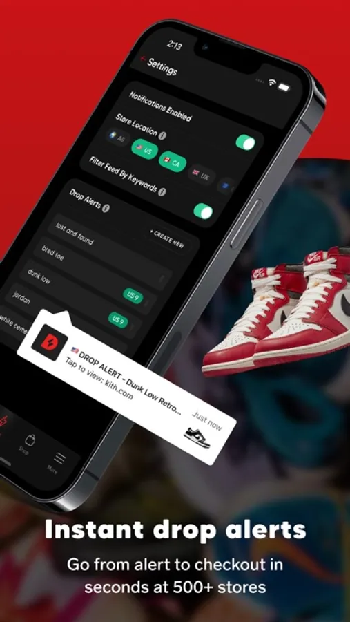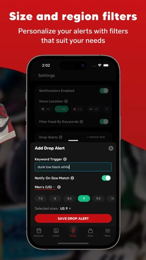 Receive real-time drop alerts from across 460+ stores worldwide such as KITH, UNDEFEATED, A Ma Maniere, Likelihood, SNKRS, Manor and Livestock, which provides you add-to-cart links to buy your size for highly sought-after sneakers before they sell out. Personalize your restock alerts by using keywords in tandem with size and region filters to truly receive notifications for only the sneakers that you want. Never miss a shock drop again!