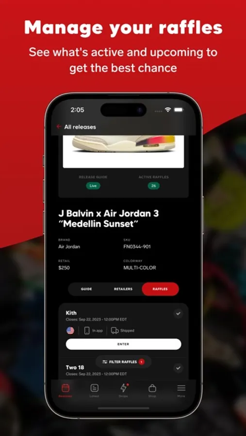 Access sneaker raffles from top brands and retailers such as Nike, Jordan, adidas, New Balance, ASICS and Salomon for FREE after creating an account. Get notified and access to special member-only raffles conducted by SoleSavy. The DROPS by SoleSavy - Sneakers app provides details of upcoming sneaker raffles such as location, raffle type, delivery method and how to enter. Filter on specific details of a raffle to customize the raffle list to fit your specific needs. Use our manual checklist to keep track of completed raffle entries to increase your chance of winning limited-edition releases.