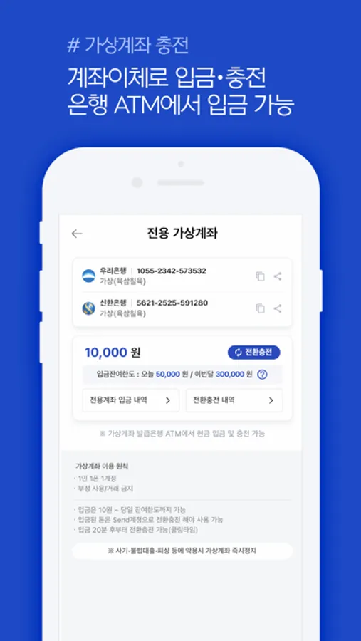 ■ 전용(가상)계좌 : 나만의 가상계좌를 만들면 은행에서 입금받아 충전