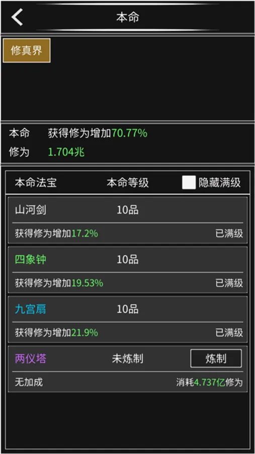 3. 修炼玩法:修真界所有修炼体系都在这里体现,简单的使用修为升级来提高修为速度,道心,仙缘