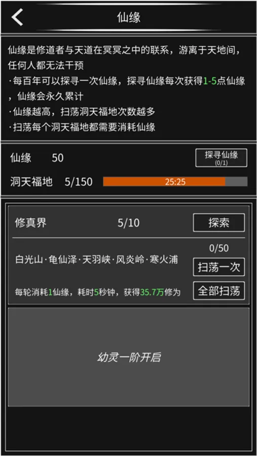 2. 仙缘玩法:类似签到系统,每天随机获得仙缘,仙缘用于扫荡洞天福地