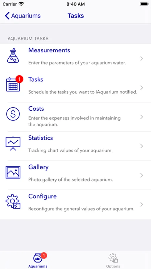 - TASKS: Create routine maintenance tasks for your aquarium and let the app help you remember them.