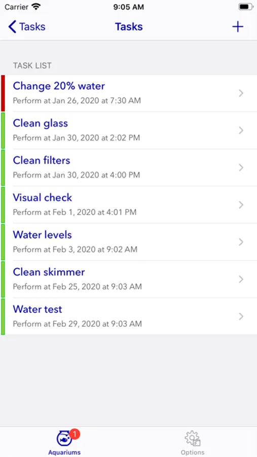 The key to an effective plan is to carry out simple basic tasks which, when completed regularly, take up very little time and result in a clean, thriving aquarium. Active biological processes can deplete some essential ingredients in the water and cause the buildup of nitrates and other unwanted substances. That is why iAquarium Logger allows you to create tasks that help you remember when to complete each of them.
