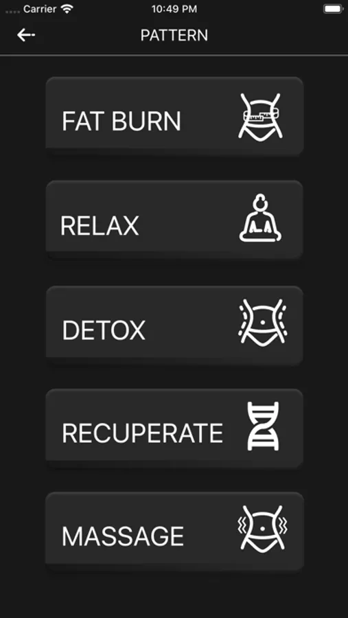 EMSFIT APP is used to control the steady and continuous output of electrical pulse of smart box. EMS technology is to simulate human brain electric signal to stimulate motor nerve with the low frequency pulse current. Through controlling the pulse current safety regulation such as frequency, interval time, time, and adjusting the contraction of muscle strength, EMS can command group muscles to work together, achieve development of muscle strength, reduce fat in shape, and realize the treatment of muscle tissue injury.