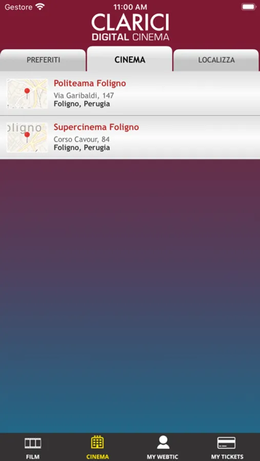Applicazione di Crea Informatica per l'acquisto dei biglietti online per il Politeama Clarici e il Supercinema Clarici di Foligno.