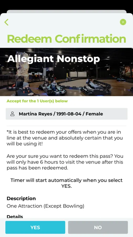 Once you are sure you’d like to use your pass and redeem the offer, you will have 6 hours to visit the venue and present your pass by using your phone to the employee at the venue. They will hit the red “VENUE ACCEPT” on your phone and give you admission or access to the venue! Once the red “VENUE ACCEPT” button has been pressed, or the 6 hour clock has expired, you will no longer be able to use that pass until it becomes available to you again, depending on the frequency that the offer is available (unlimited, weekly, monthly, yearly, etc).