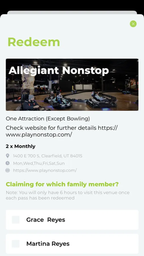 Simply select the offer you wish to use. After this, you will be asked to choose which members on your account will be joining you at the venue. Then you will hit “REDEEM”.