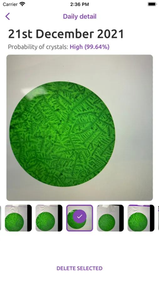 Hold the microscope against the camera and take a picture of the saliva sample. The app recognizes the saliva crystals.
